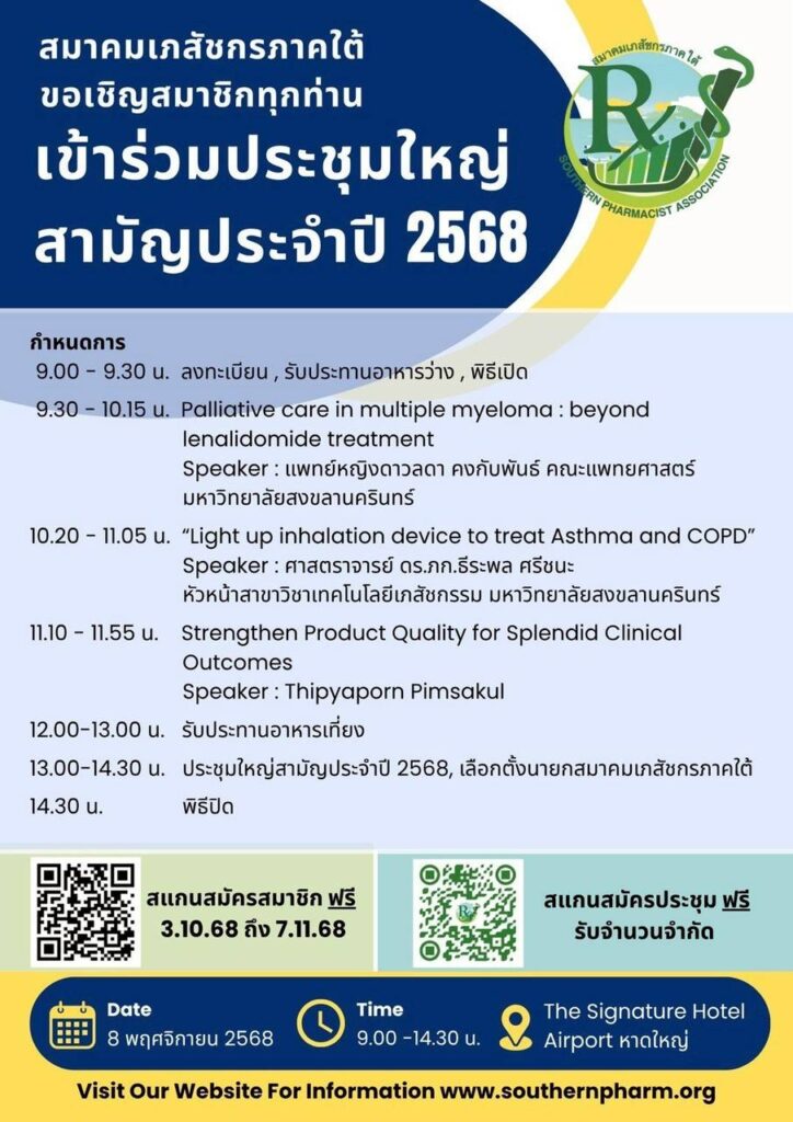 ประชาสัมพันธ์การประชุมสามัญประจำปีสมาคมเภสัชกรภาคใต้ (สภต.) ในวันที่ 8 พฤศจิกายน 2568 โดยสมาชิกสมาคมฯ สามารถลงทะเบียนได้ฟรี ! ไม่มีค่าใช้จ่าย ผ่านช่องทางออนไลน์รายละเอียดและกำหนดการดังแสดง