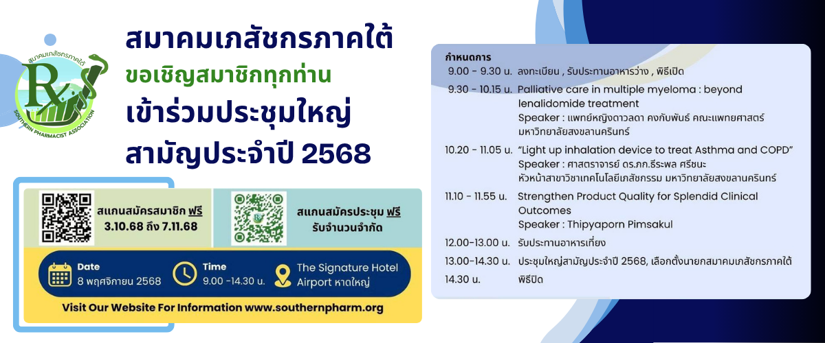 ประชาสัมพันธ์การประชุมสามัญประจำปีสมาคมเภสัชกรภาคใต้ (สภต.) ในวันที่ 8 พฤศจิกายน 2568 โดยสมาชิกสมาคมฯ สามารถลงทะเบียนได้ฟรี ! ไม่มีค่าใช้จ่าย ผ่านช่องทางออนไลน์รายละเอียดและกำหนดการดังแสดง