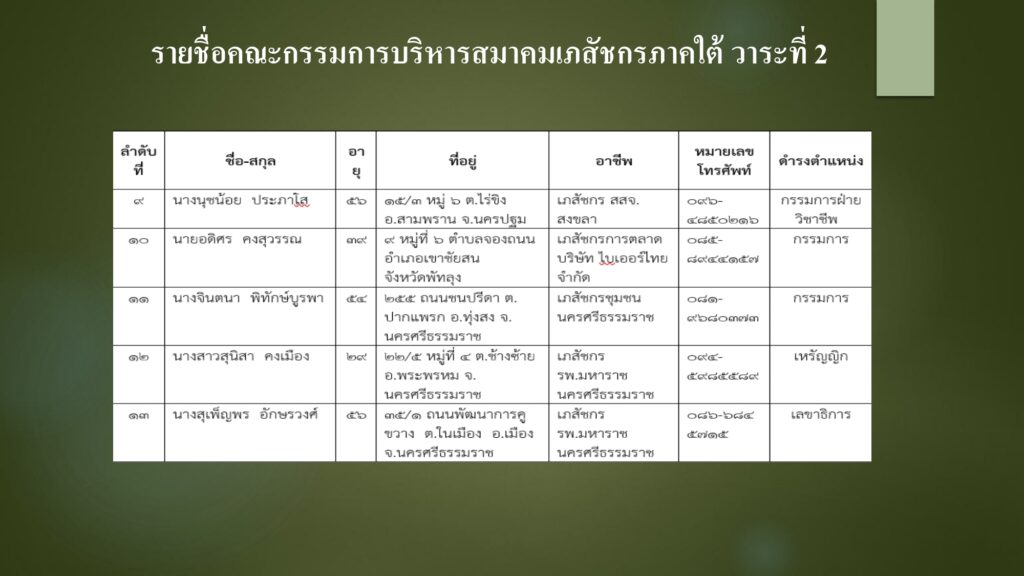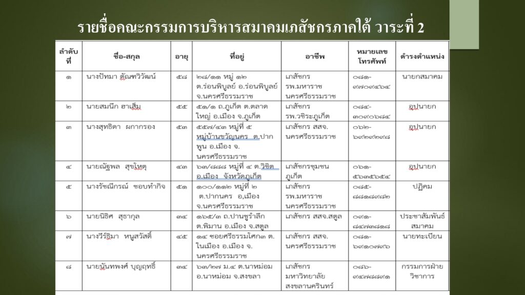 คณะกรรมการบริหารสมาคมเภสัชกรภาคใต้ นำโดย ภญ.ปัทมา ตัณฑวิวัฒน์ นายกสมาคมเภสัชกรภาคใต้ (วาระที่ 2) ขอประกาศ รายชื่อคณะกรรมการบริหารสมาคมเภสัชกรภาคใต้ วาระที่ 2 รวมถึง นโยบายและแผนงานของสมาคมเภสัชกรภาคใต้ วาระที่ 2 ดังต่อไปนี้